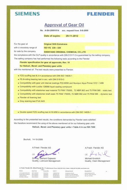 我公司的全合成PAO风力发电专用齿轮油已于2009年10月14日正式获得德国西门子-弗兰德公司的认证,今日我司接到了弗兰德公司的正式通知。弗兰德是全球最权威的风力发电机变速箱制造商。我司是国内第一家获此认证的润滑油公司!