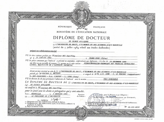 1988年12月10日,奥吉娜集团创始人魏国平博士以“优秀”成绩通过了马赛石油化学及工业有机合成学院EPSOI博士论文答辩,取得博士学位。
