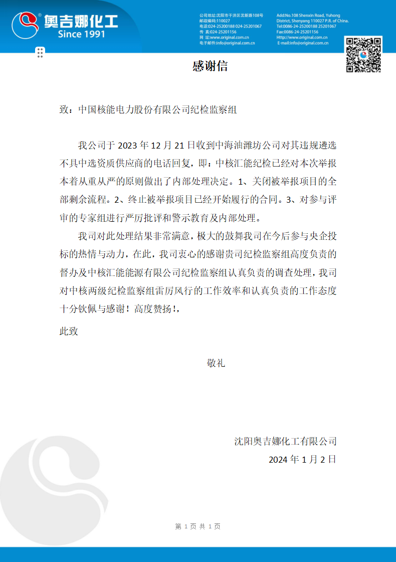 2024年1月2日,新年伊始第一个工作日,奥吉娜公司便怀着无比真诚、敬重的心情寄出了一封感谢信,感谢信是写给中国核能电力股份有限公司纪检监察组的,奥吉娜为什么要寄出这封感谢信呢?