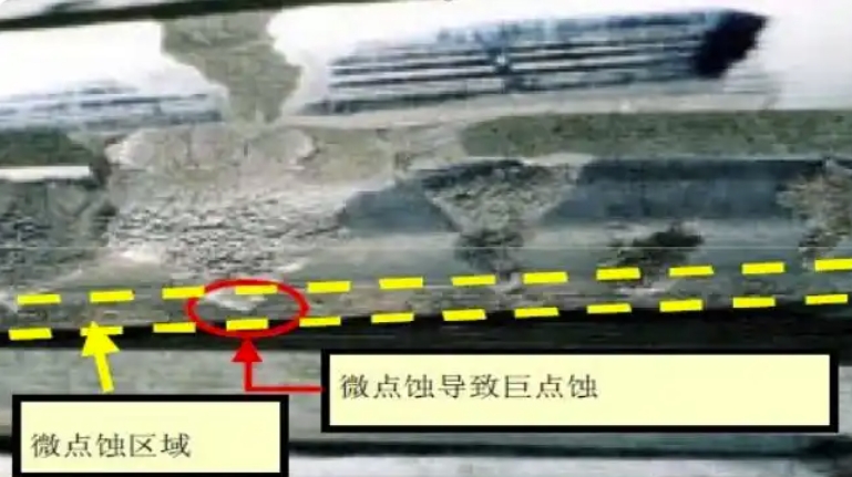 微点蚀,又称“灰斑”,普遍存在于齿轮副表面,是一种表面疲劳并伴有材料脱落的磨损形式。显微镜下观察,会看到密密麻麻成片的小坑或微小裂纹。尽管微点蚀不是一个新现象,由于微点蚀导致设备失效是一个较漫长的过程,所以人们对微点蚀的危害性认识不足。因风电机组运行环境恶劣,常年经受变风向、变负荷作用,频繁出现微点蚀从而导致风机齿轮箱失效,所以在风电机组运行维护的过程中,风机齿轮的微点蚀问题日益突出。风电机组中微点蚀主要发生在低速重载齿轮面上,在齿面啮合过程中,在较高的接触应力和相对摩擦作用下,导致齿面局部温度升高,润滑油膜破裂,齿面间的润滑方式呈边界润滑状态,使得两齿面的波峰发生直接接触,进而导致微点蚀。齿面表面一旦产生微点蚀,将降低风电机组齿轮组齿牙的精确度,增加动态负荷,进而造成噪音增加、振动加强,并增加齿轮疲劳失效的机会,严重时可导致点蚀、剥落甚至断齿(见图2)。