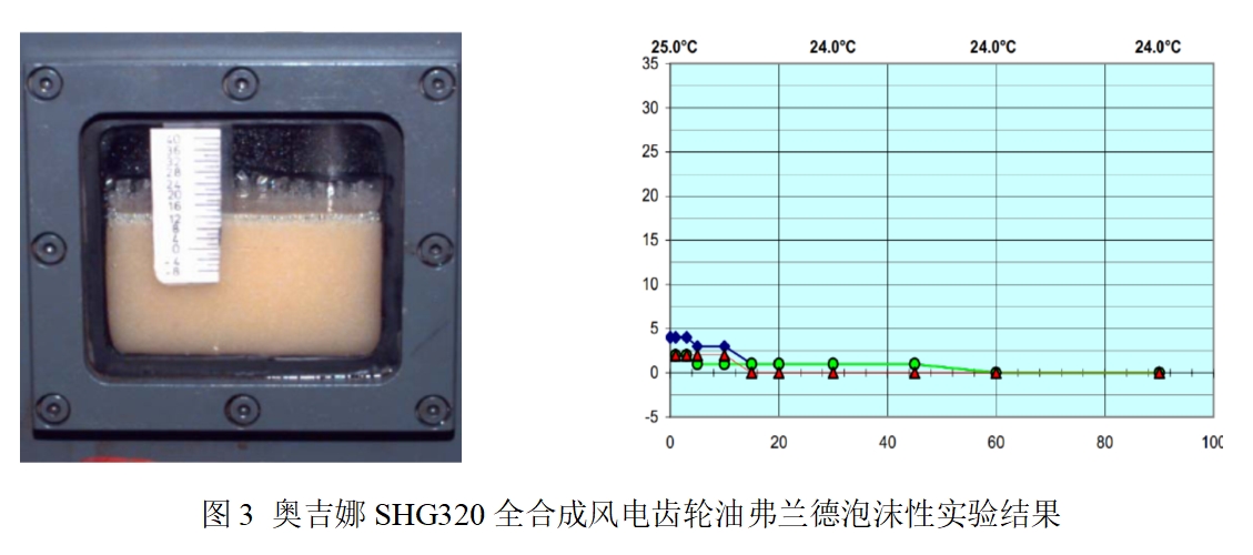 依据Flender(弗兰德)泡沫性试验GG-V425的试验要求,对奥吉娜全合成风电齿轮油SHG320进行了泡沫性评价(实验结果见图3),在整个实验过程中,形成的泡沫量不到5%,远远小于Flender试验要求的15%,抗泡沫性能优越。同时消泡剂的特殊结构也减少了过滤设备对它的吸附,使得使用过程中损耗减小,完全满足了风电齿轮油长寿命的要求。