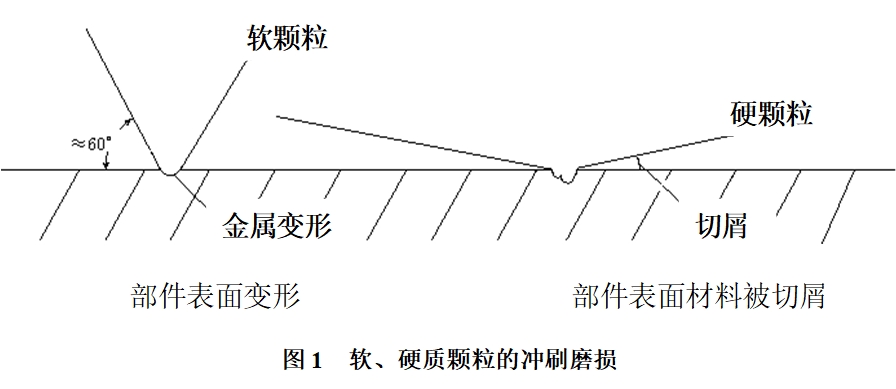 “冲蚀”磨损是指污染颗粒随着高速流动的油液,不断向油液系统中部件的表面吹射冲刷,使被冲刷部位受到磨损。污染颗粒有软硬之分,软质颗粒的冲蚀磨损使被冲击部件表面变形,在表层下产生缺陷后损坏。硬质颗粒的冲蚀磨损使被冲刷部件表面材料晶格错位、滑移,加剧部件疲劳或使材料表面直接被切屑剥离而形成严重磨损。如图1所示。