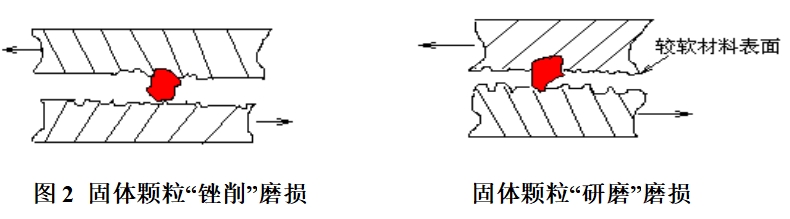 “研磨”磨损是指两个相对运动部件的间隙中,进入与间隙尺寸相近的硬质颗粒。部件运动时,硬质颗粒与运动部件表面相接触,像研磨剂一样对所接触的配合表面起着磨削作用,使配合面损伤。这种磨损是油液系统中主要的磨损形式。见图2所示。
