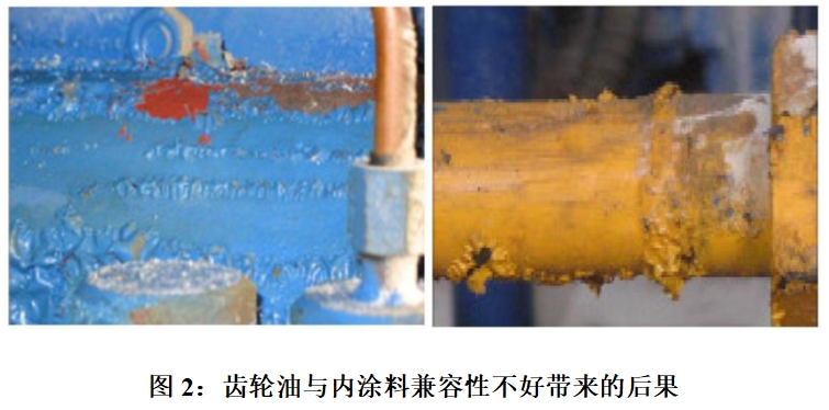 如果齿轮油和涂料兼容性不好,会导致内涂料松弛堆积甚至悬浮于齿轮油中,从而无法起到防腐蚀的作用,堵塞过滤器,甚至会缩短换油周期。图2为内涂料与齿轮油兼容性不好的实例。